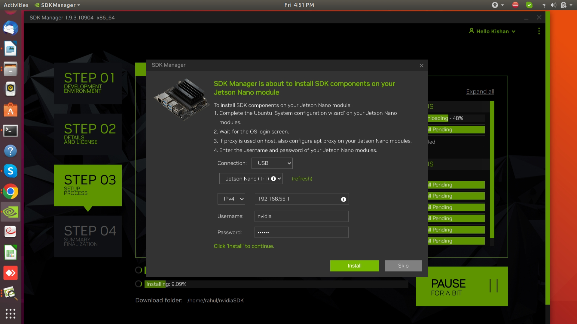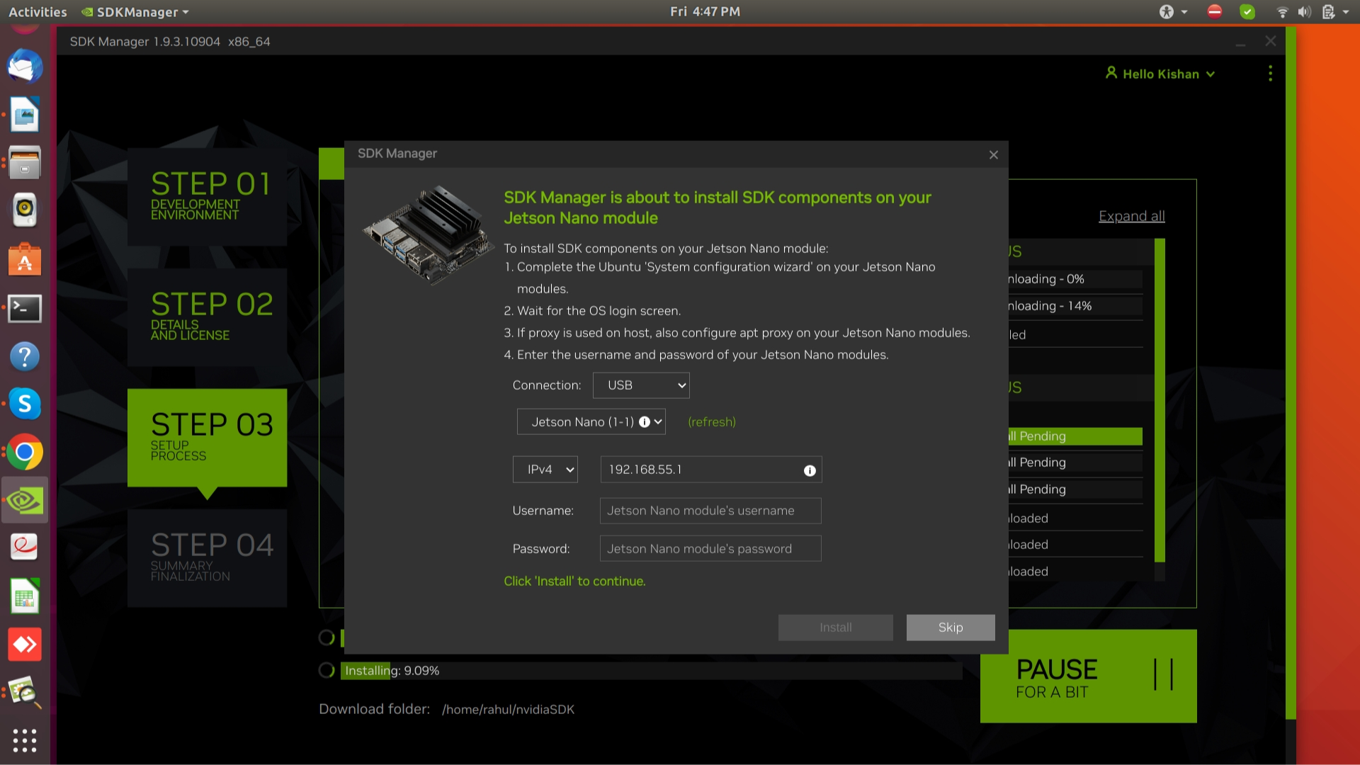 Then your display come above image Enter your Jetson Nano Username and Password then click Install