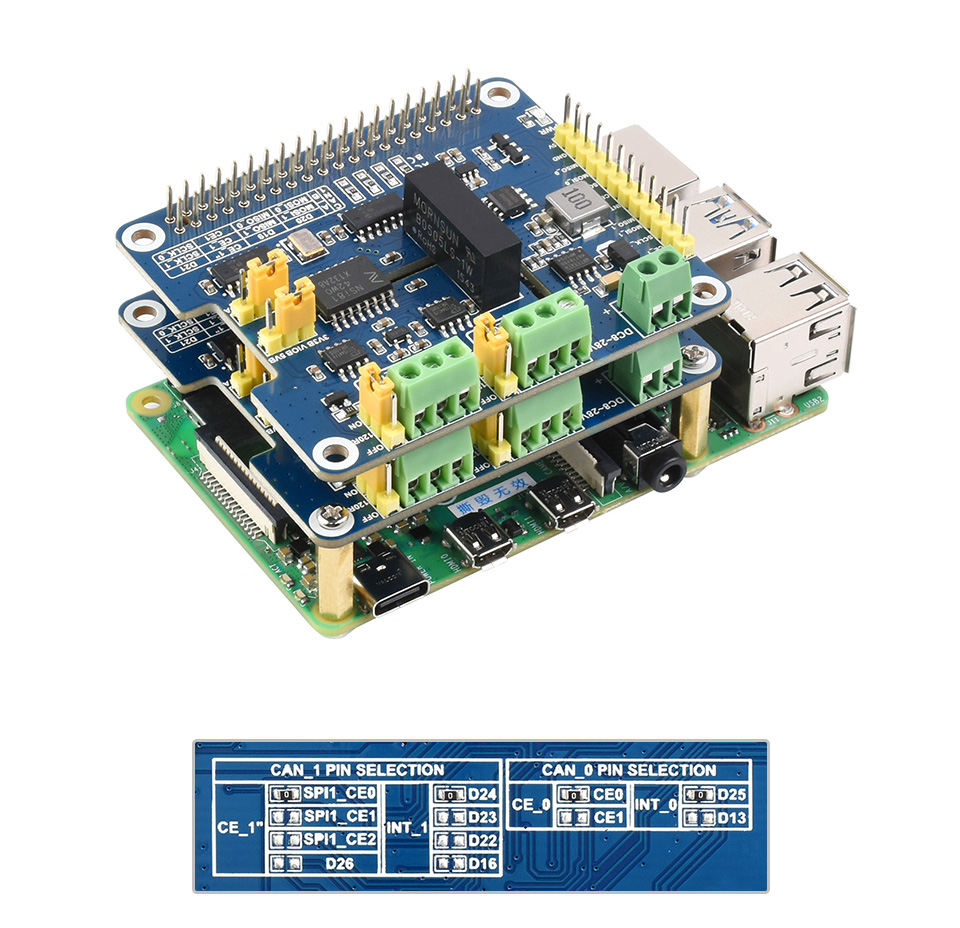 Onboard SPI0 / SPI1 chip select and interrupt pin configuration, avoid conflicting with other SPI slave devices, also used for cascading to support 4-ch CAN communication