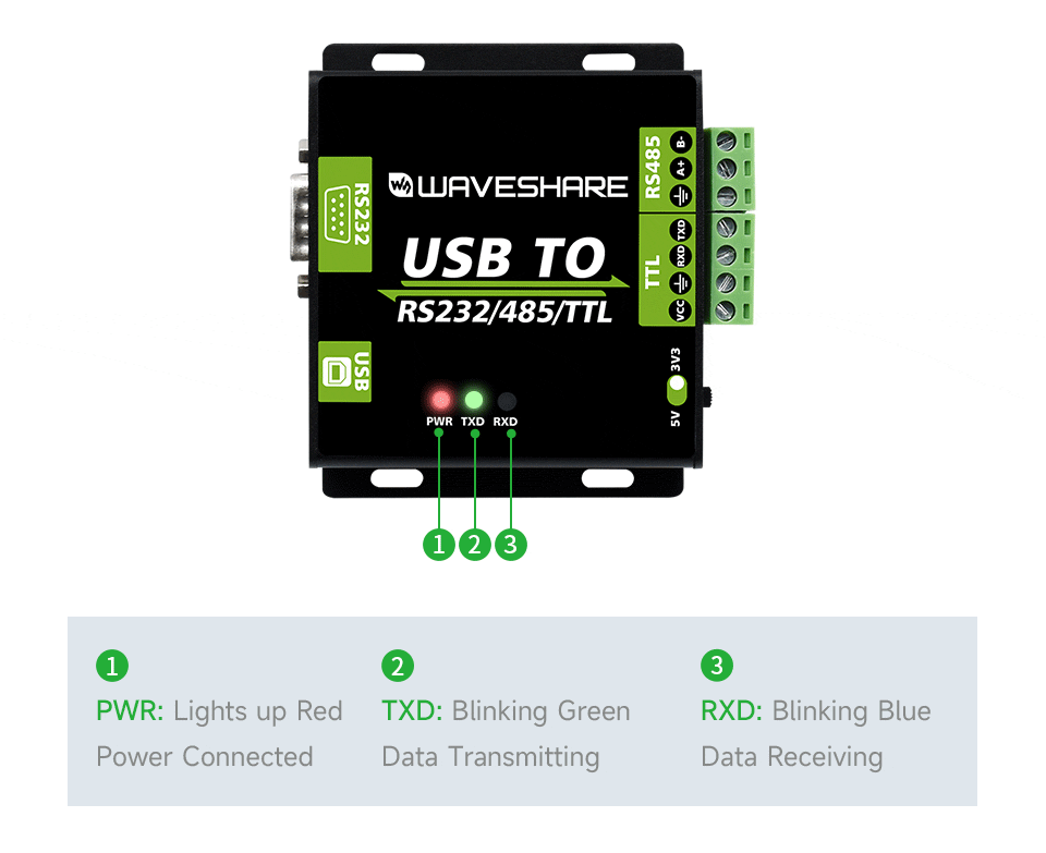 | RXD | Blue RX indicator, light up when the device ports send data back | ||||
