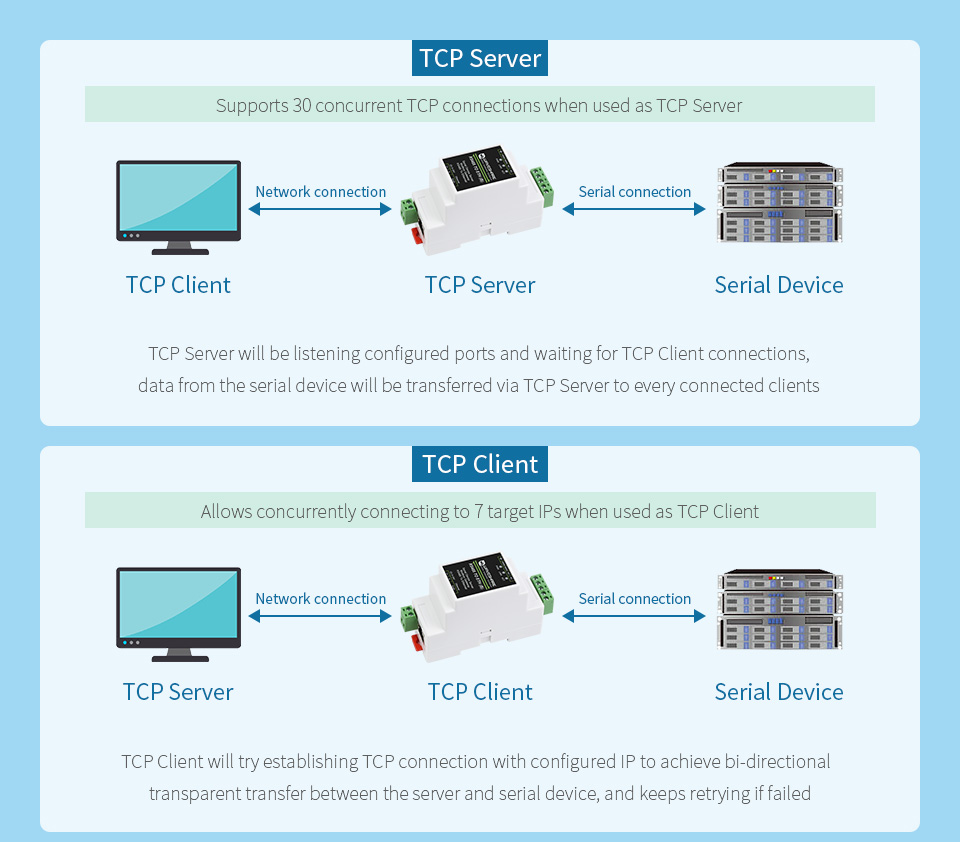 | Operating mode | TCP server, TCP client (coexisting with TCP server), UDP, UDP multicast | ||||