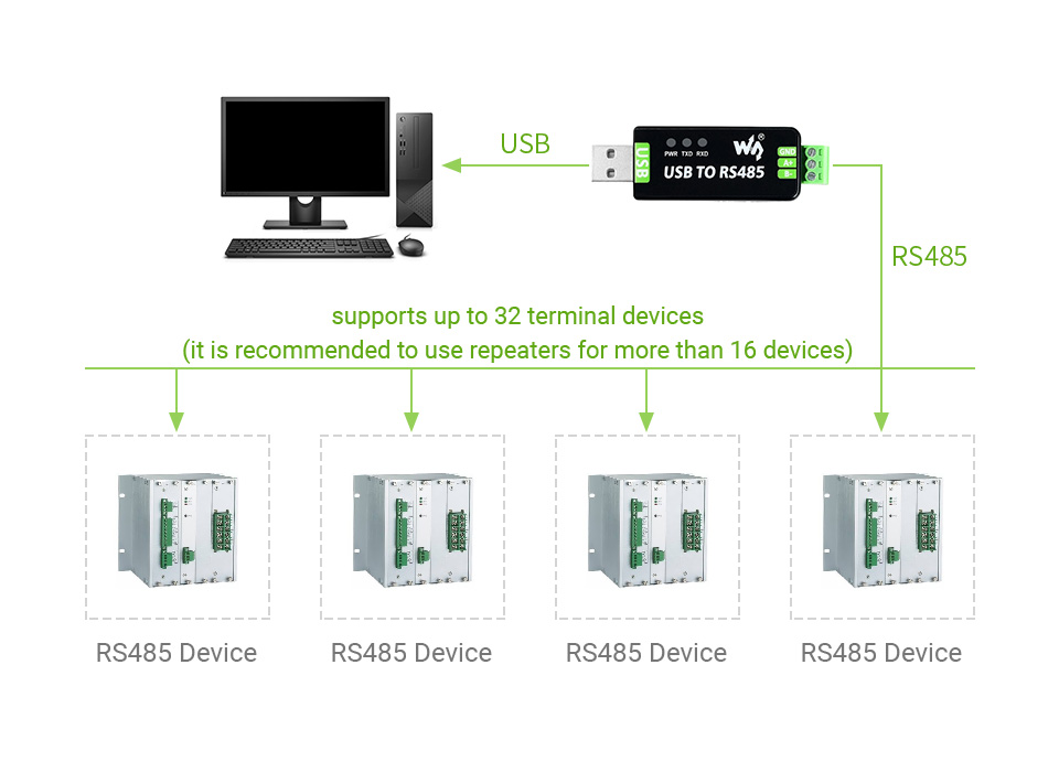 The USB signal can be converted into a balanced differential RS485 signal and the transmission rate is stable. The reliable speed is 300-921600bps, the transmission distance is about 1.2km for RS485, and about 5 meters for USB.