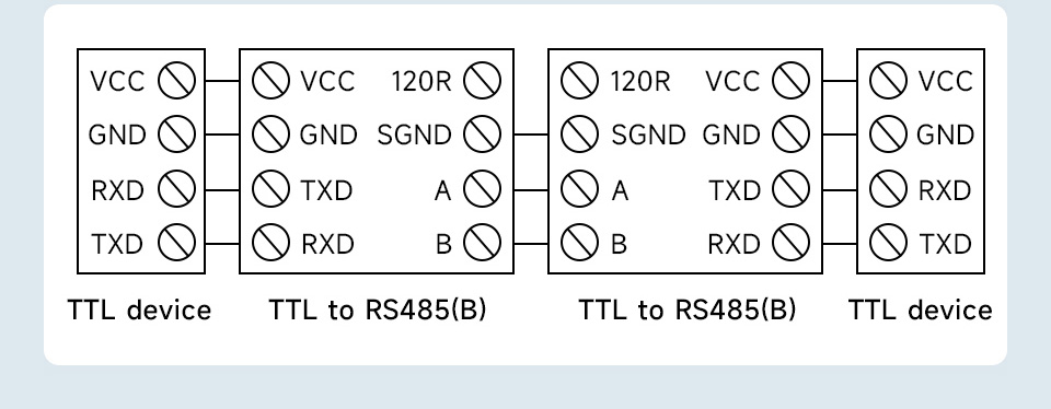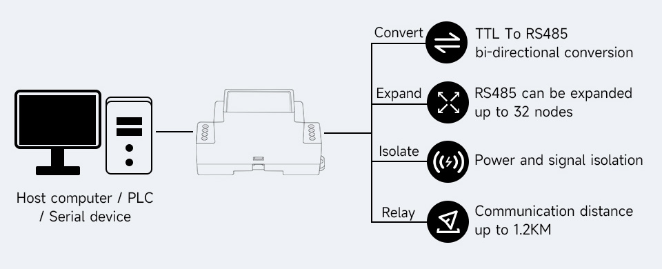 The TTL To RS485 (B) can be widely used for point-to-point, point-to-multipoint, long distance cascaded communication network between two hosts, or between host and MCU/Peripheral. It also can be used in the application scenarios that require TTL To RS485 conversion such as Industrial Automation and IoT.