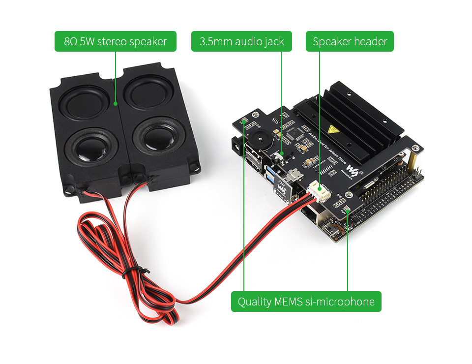 onboard quality MEMS si-microphone, 3.5mm audio jack, and speaker header (comes with 8Ω 5W stereo speaker)
